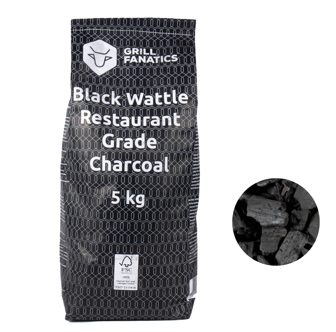 Grill Fanatics Black Wattle lesno oglje je izdelano iz 100 % lesa Black Wattle, ki zagotavlja dolgo gorenje, visoke temperature in minimalno količino dima. Idealno za keramične žare, steak, pice in počasne peke low and slow. Pakirano v priročnih 5 kg vrečah.